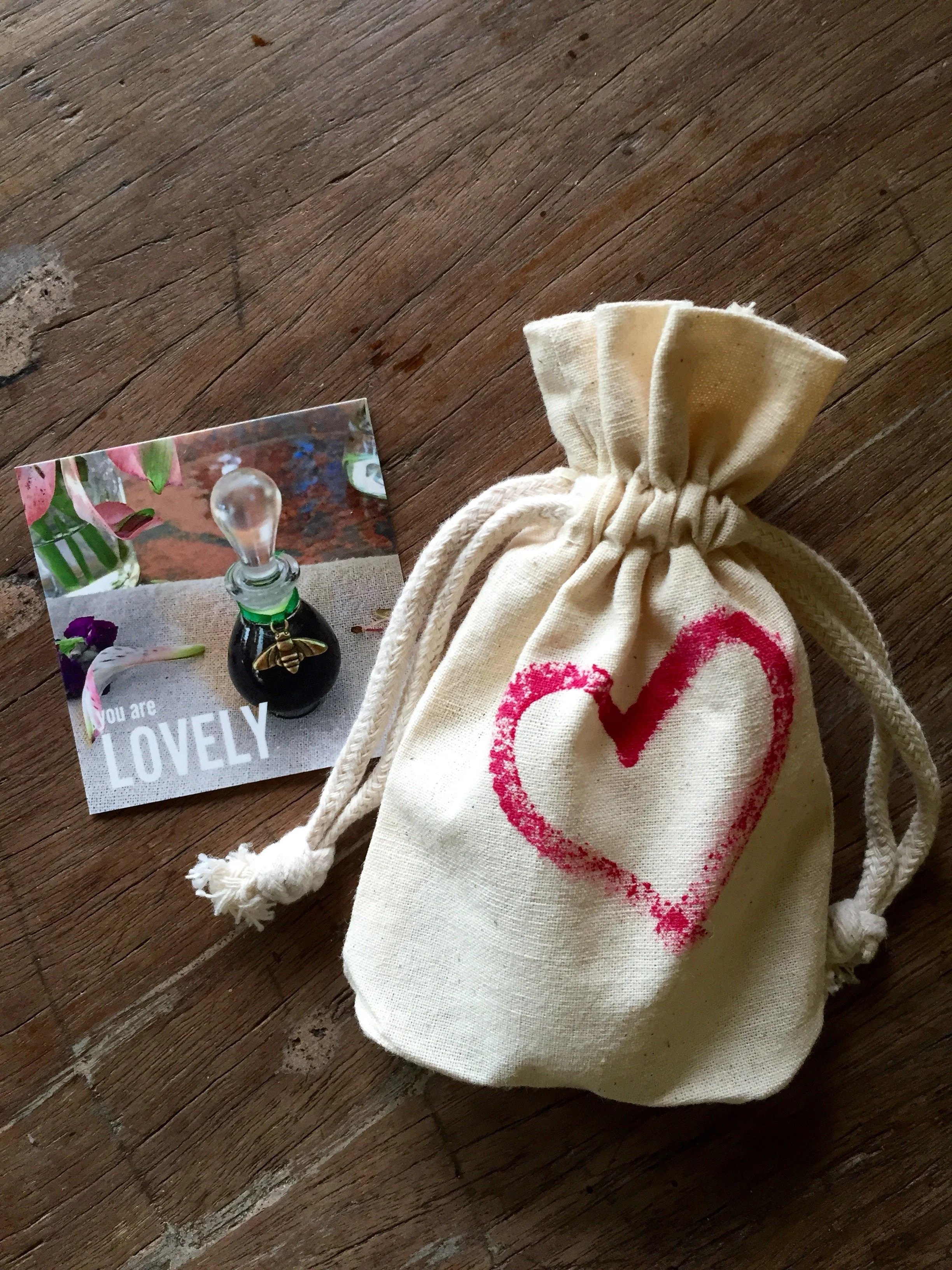 Individual gifts are packaged in a rustic burlap or fabric drawstring bag with a hand painted symbol (heart, yin yang, om) and a small card.